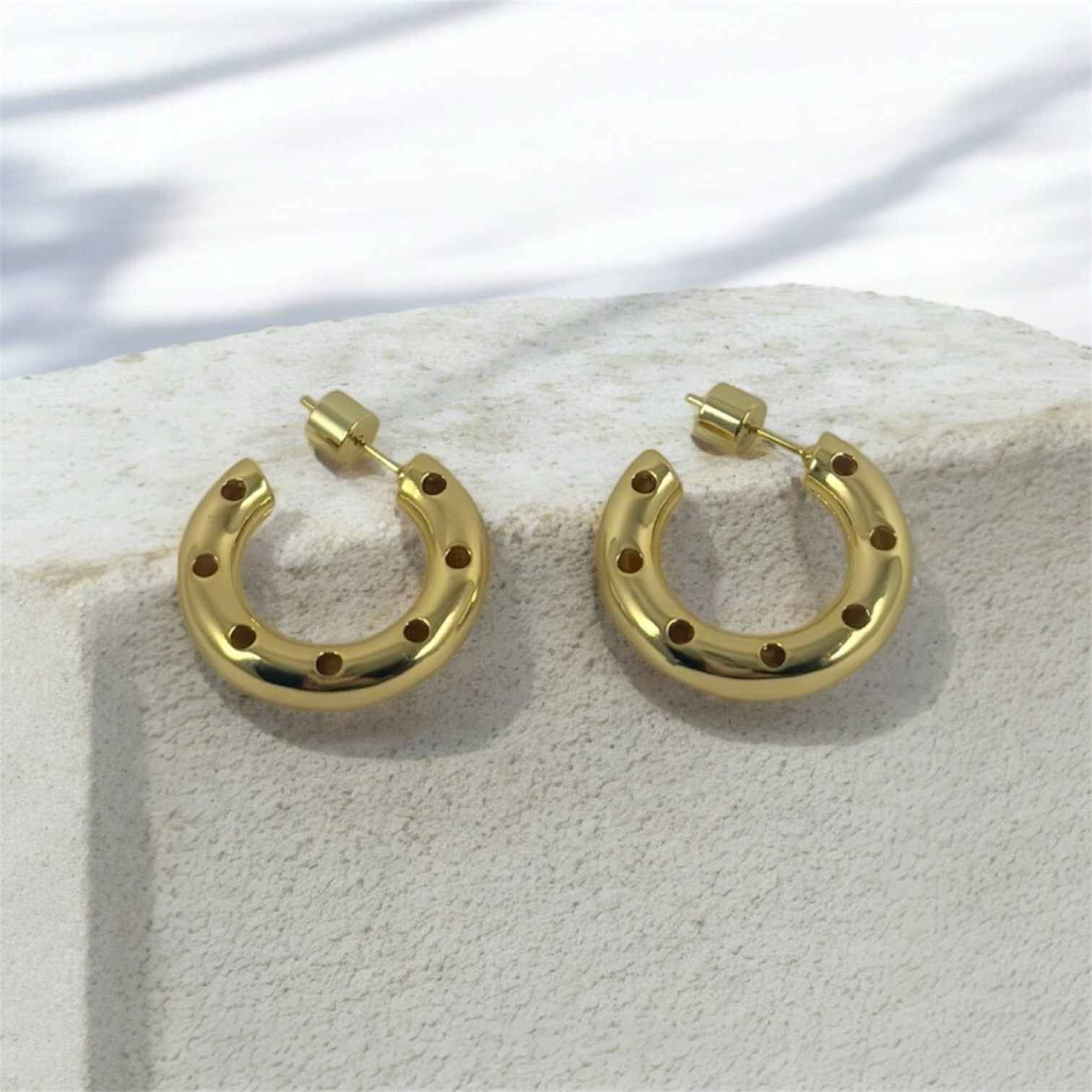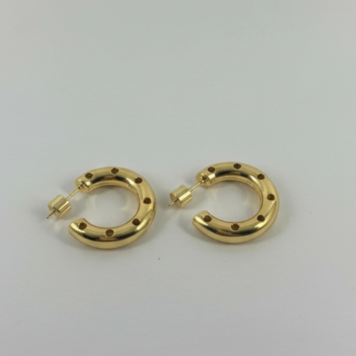 Upgrade your jewelry collection with our Dotted Earrings. Crafted with 18k Gold plated over Brass, these earrings offer long lasting plating and a 30mm Diameter. Elegant yet versatile, they can...