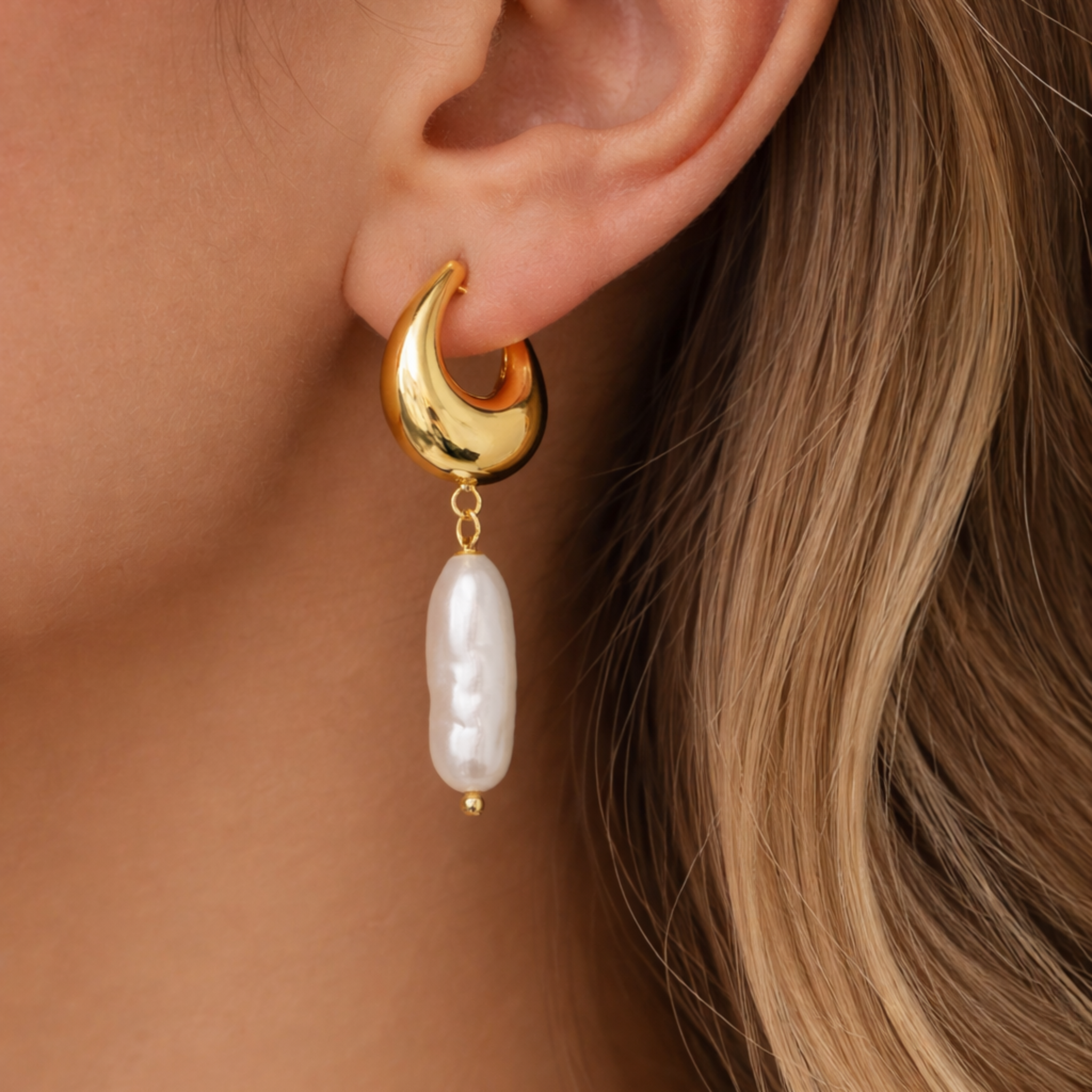 18k gold plated Pearl Drop Earrings combine a sculpted, contemporary hoop with an elegant pearl drop for a timeless yet modern look. The hoop design transitions smoothly from slim to...