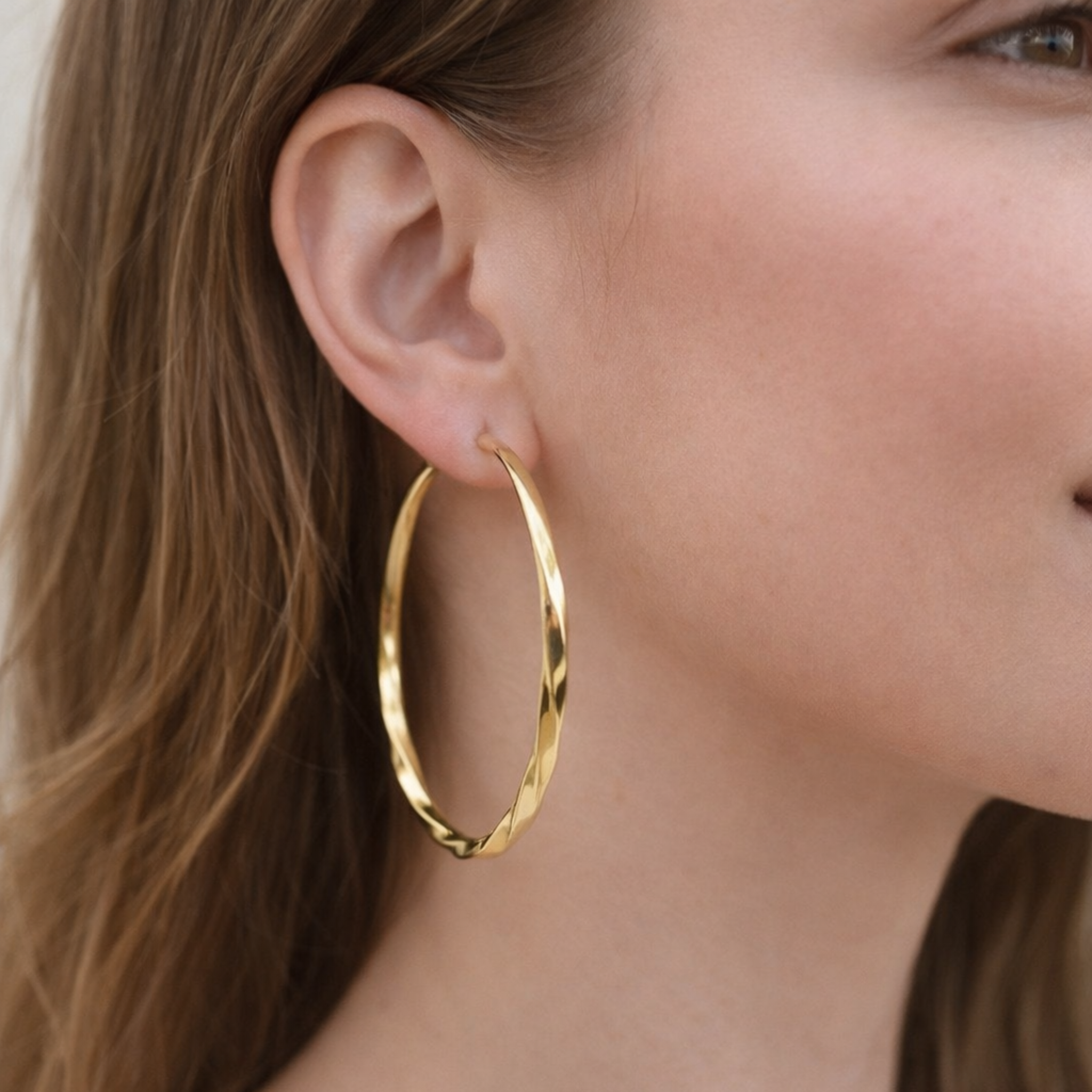 These elegant 40mm open hoops feature a unique old twisted design that reflects light beautifully with every turn. Crafted from durable brass and plated in radiant hypoallergenic 18K gold, they’re...