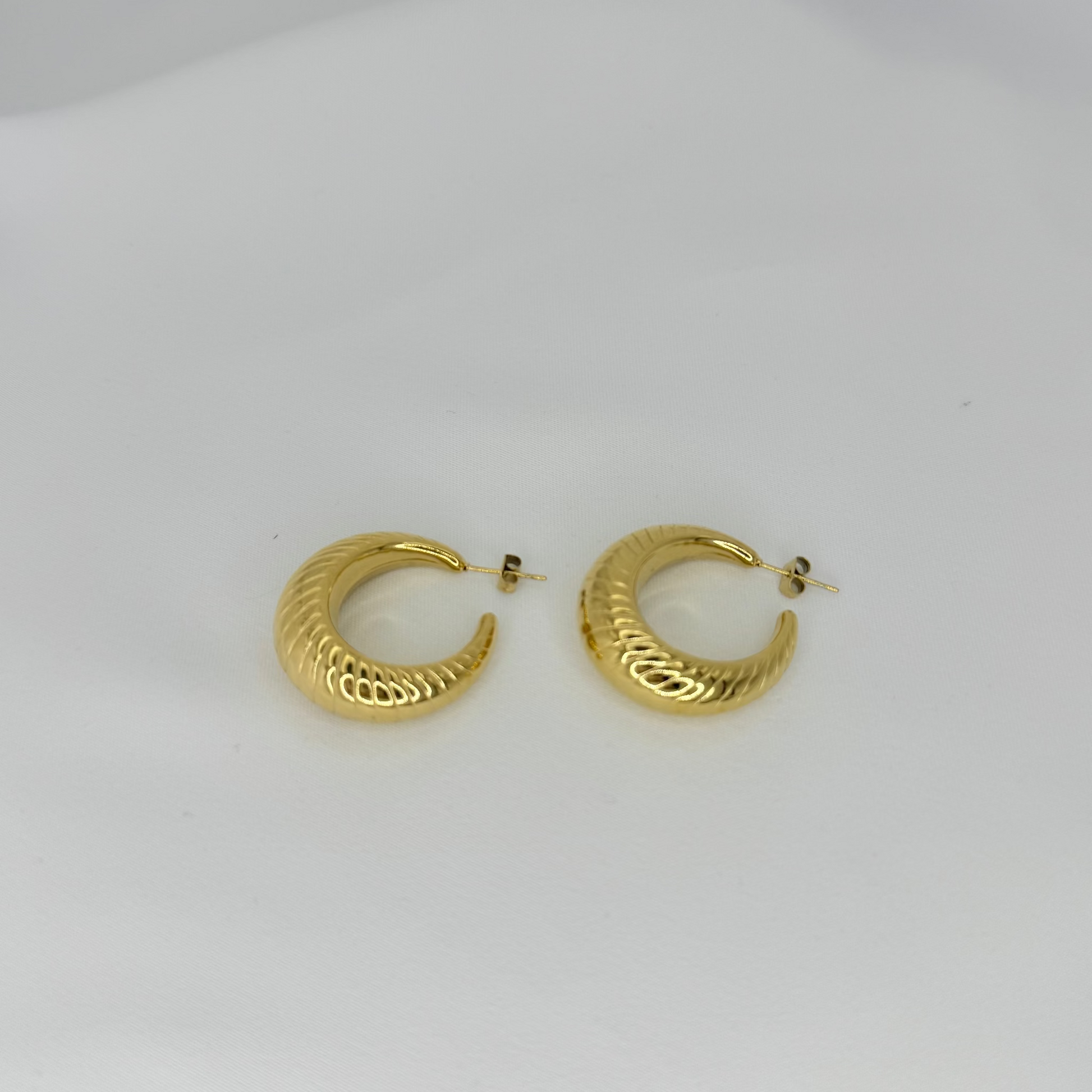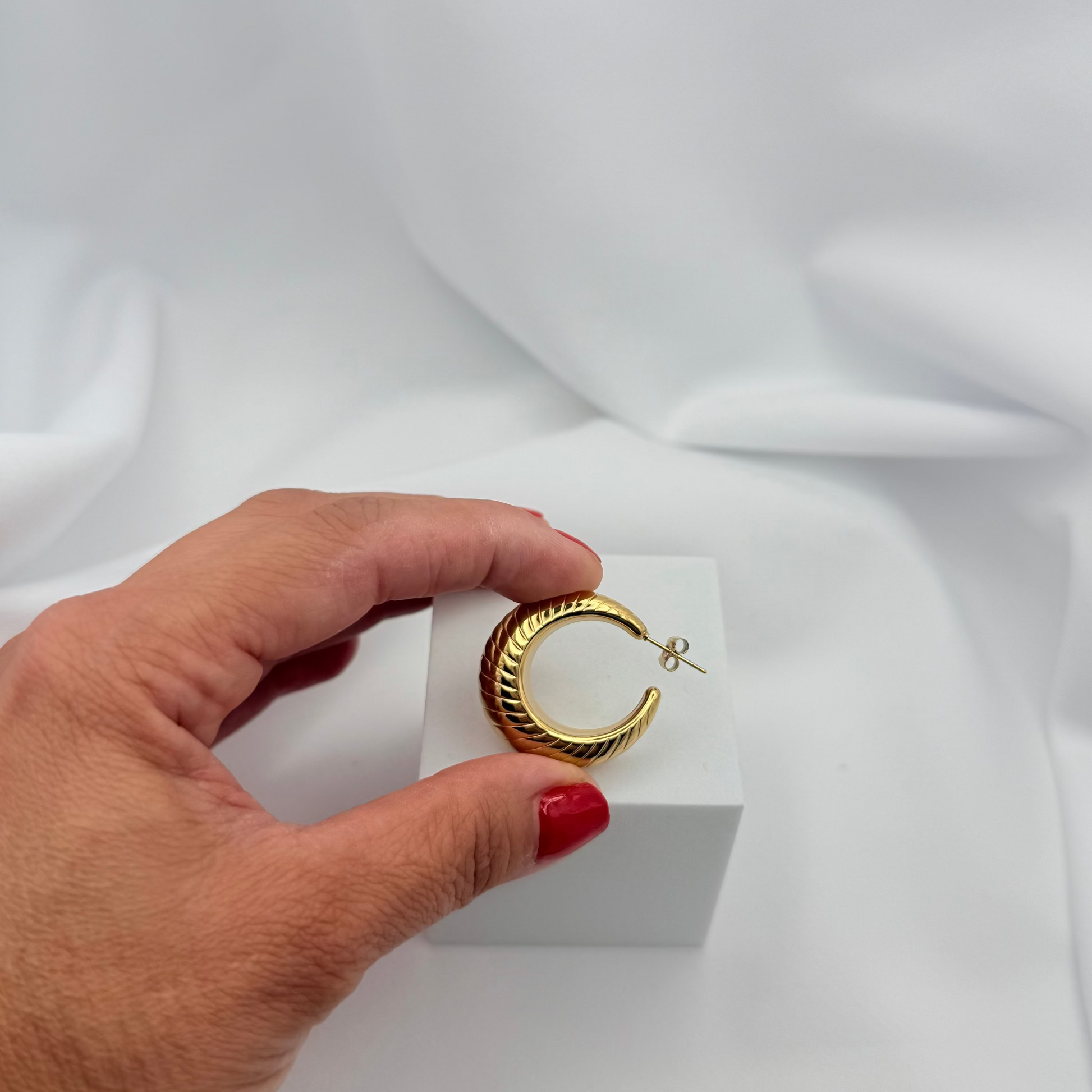 Elevate your style with these stunning Crescent Moon Hoop Earrings. Measuring 30mm in diameter and 8mm thick, they feature a bold crescent moon shape with a refined ribbed design. Crafted from high-quality stainless steel and finished with a luxurious 18K gold plating, these earrings are lightweight, hypoallergenic, and comfortable for all-day wear. A perfect balance of elegance and statement, they make an essential addition to any jewelry collection.