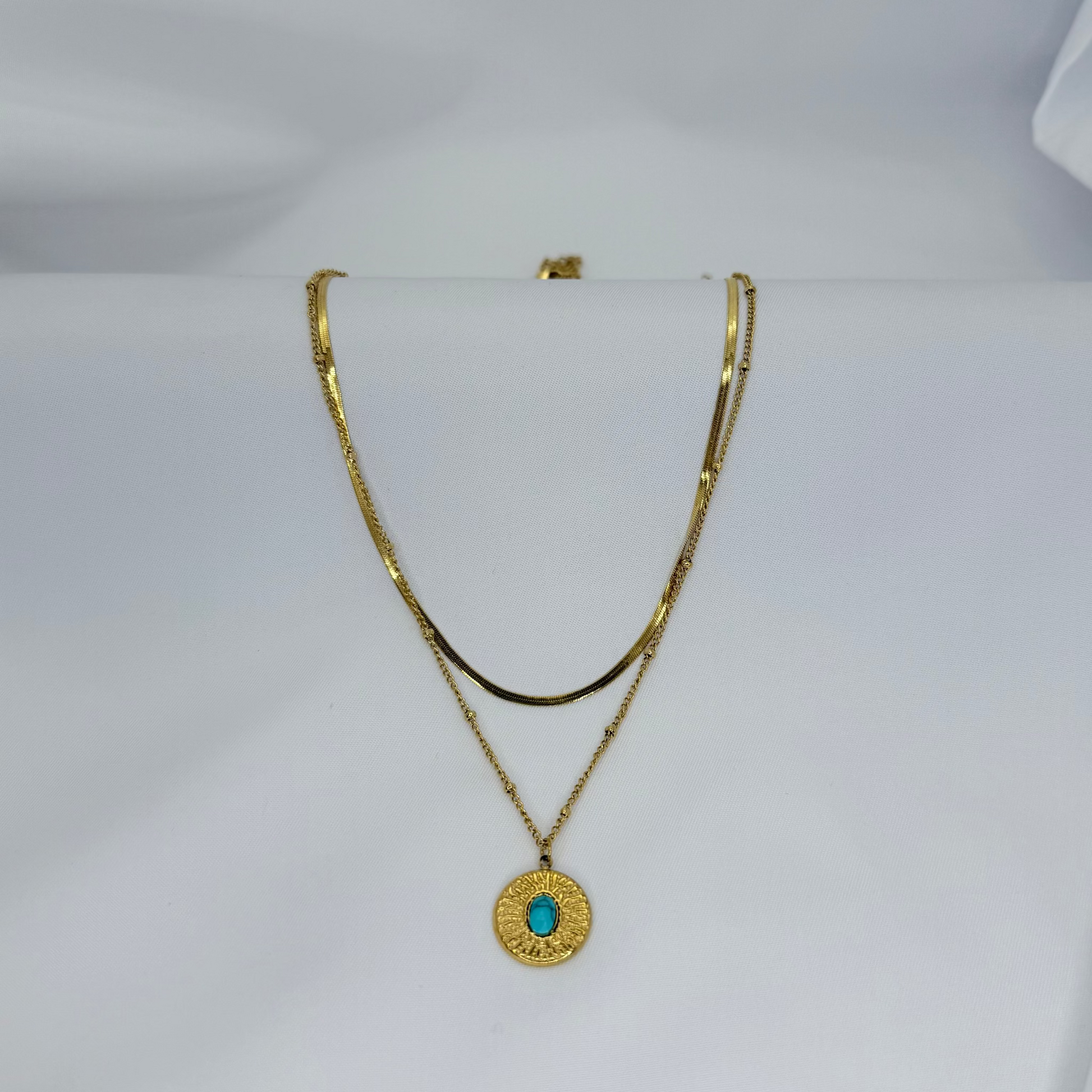 Discover the perfect balance of elegance and versatility with our 18k Delicada Dúo Necklaces. Crafted from durable stainless steel, the first necklace features a flat stake design and measures 14 inches long with an additional 2 inches of extension. The second necklace boasts a charming coin adorned with a turquoise stone, adding an extra touch of color to the 16 inch ball chain, also with 2 inches of extension. Elevate any outfit with this stunning duo.