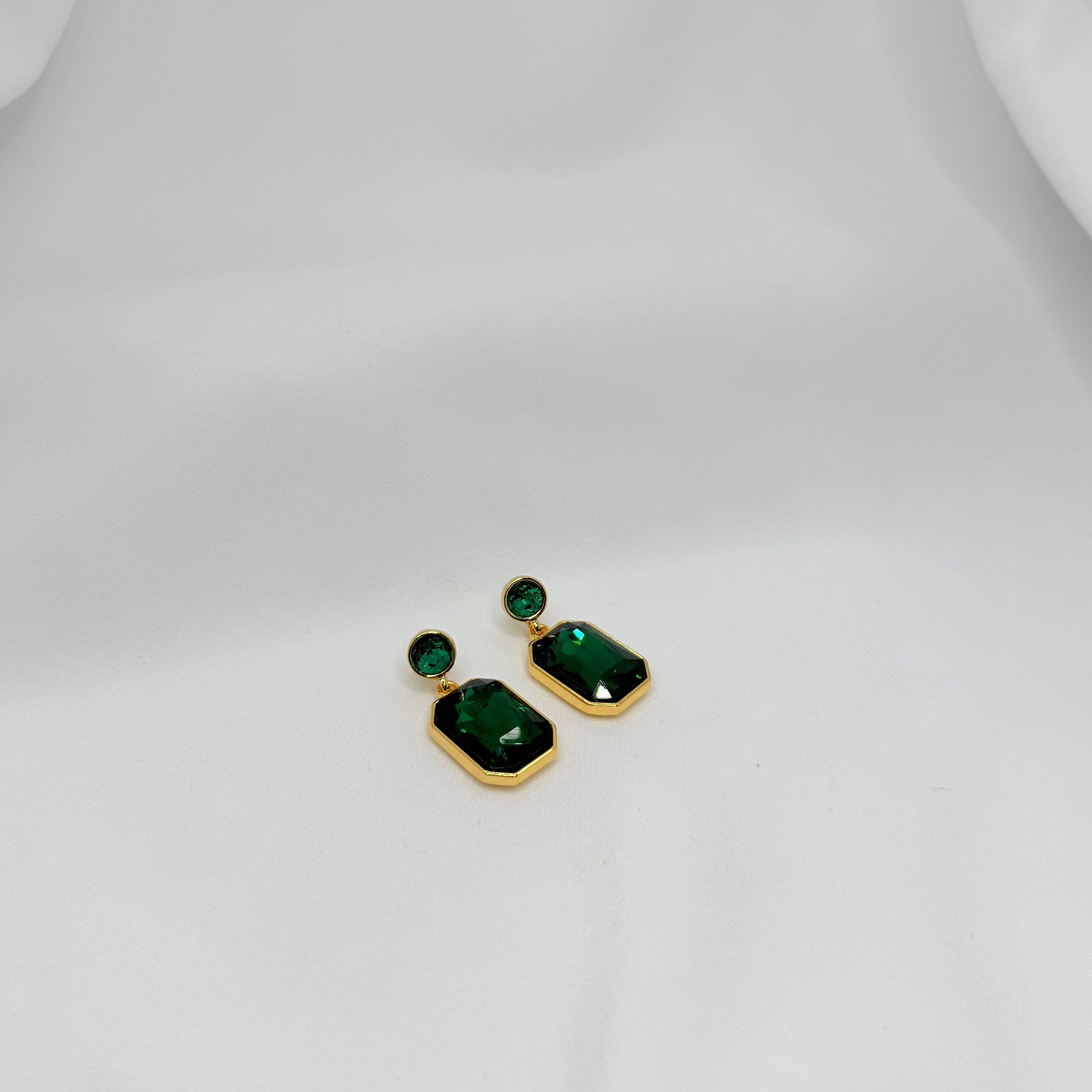 Bring timeless elegance to any look. Crafted with vivid emerald-green crystal that catch the light beautifully, each earrings is set in 18k gold-plated brass for a luxuries finish.