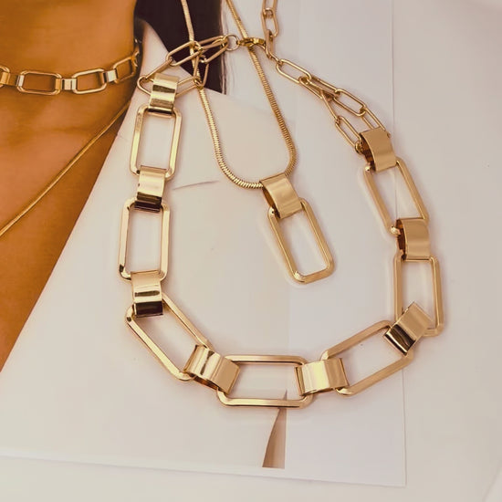 A sophisticated two-layer set that combines bold geometry with sleek minimalism. The top piece features a 12 mm rectangular-link choker that can also be worn as a short necklace, exuding contemporary elegance. The second layer is a refined snake chain showcasing a matching rectangular pendant for a cohesive, polished look. Crafted in high-quality brass and plated in 14 karat gold, this set is hypoallergenic and perfect for stacking or wearing solo to make a statement.