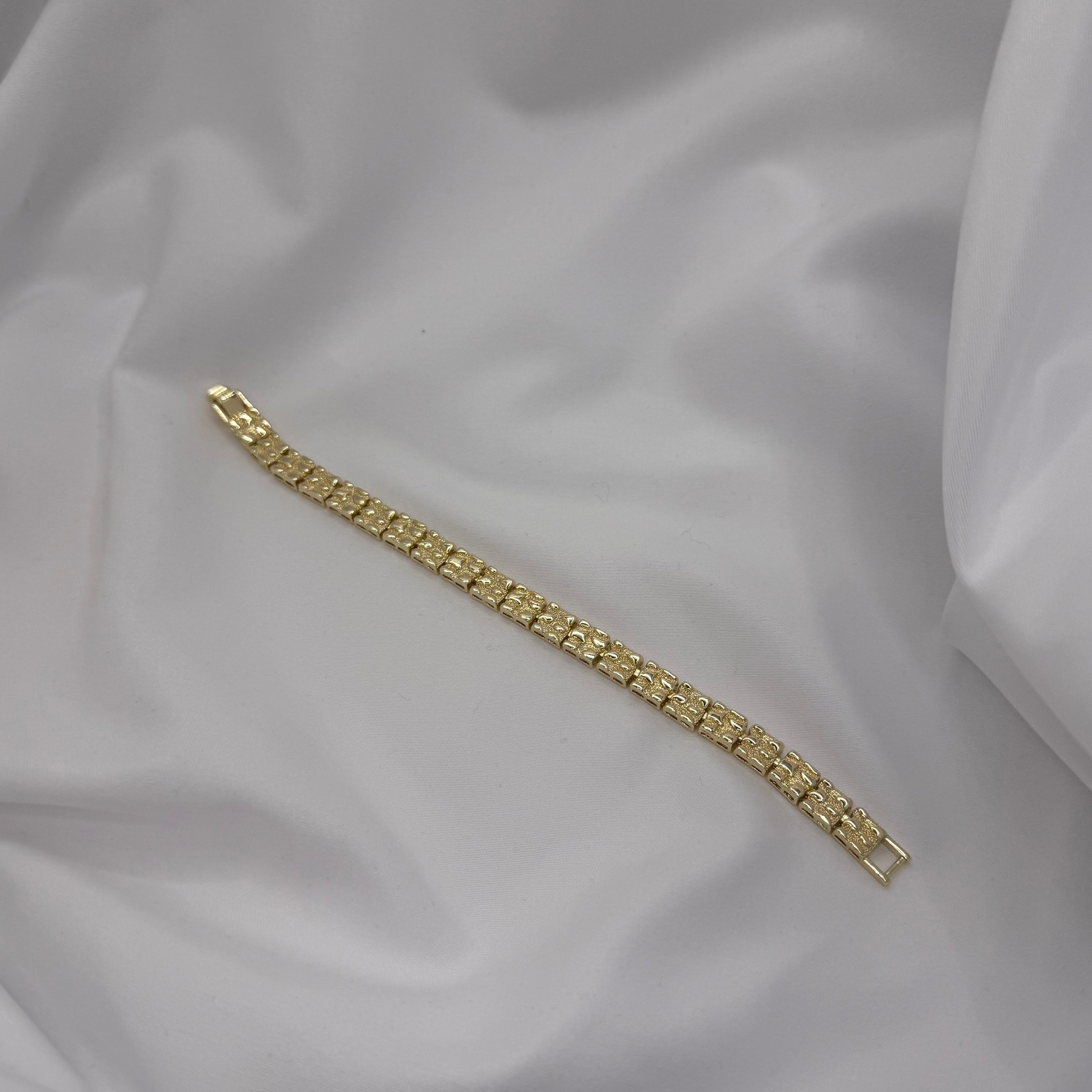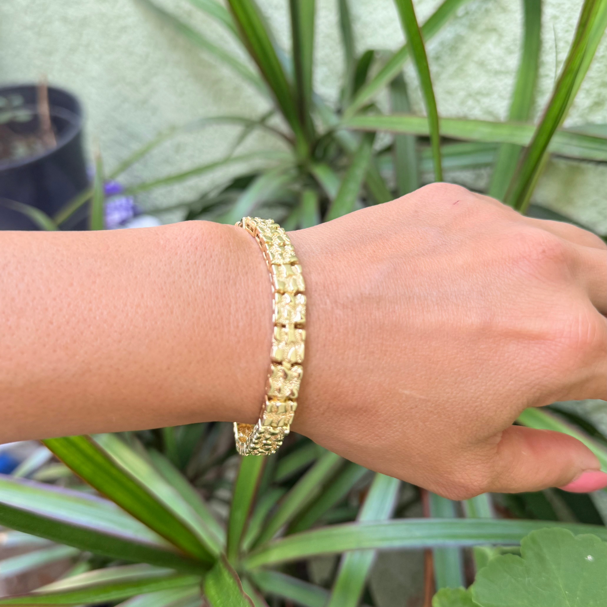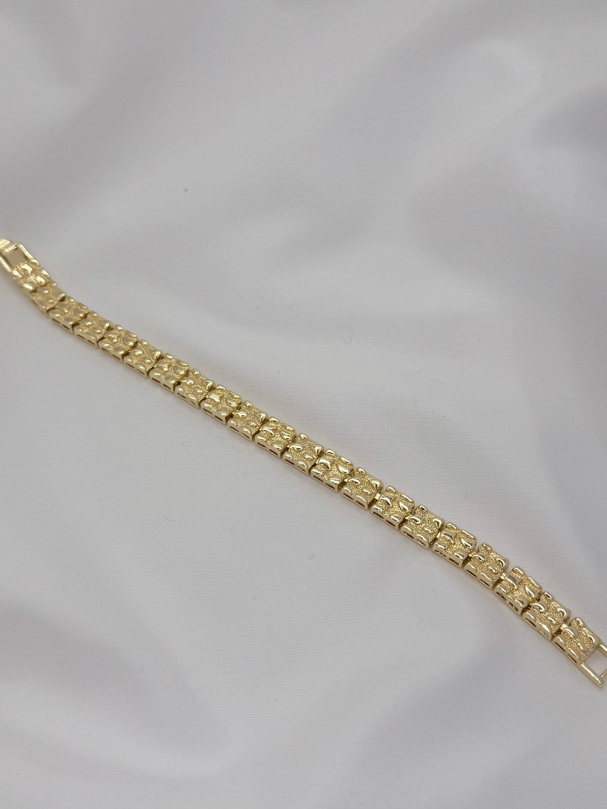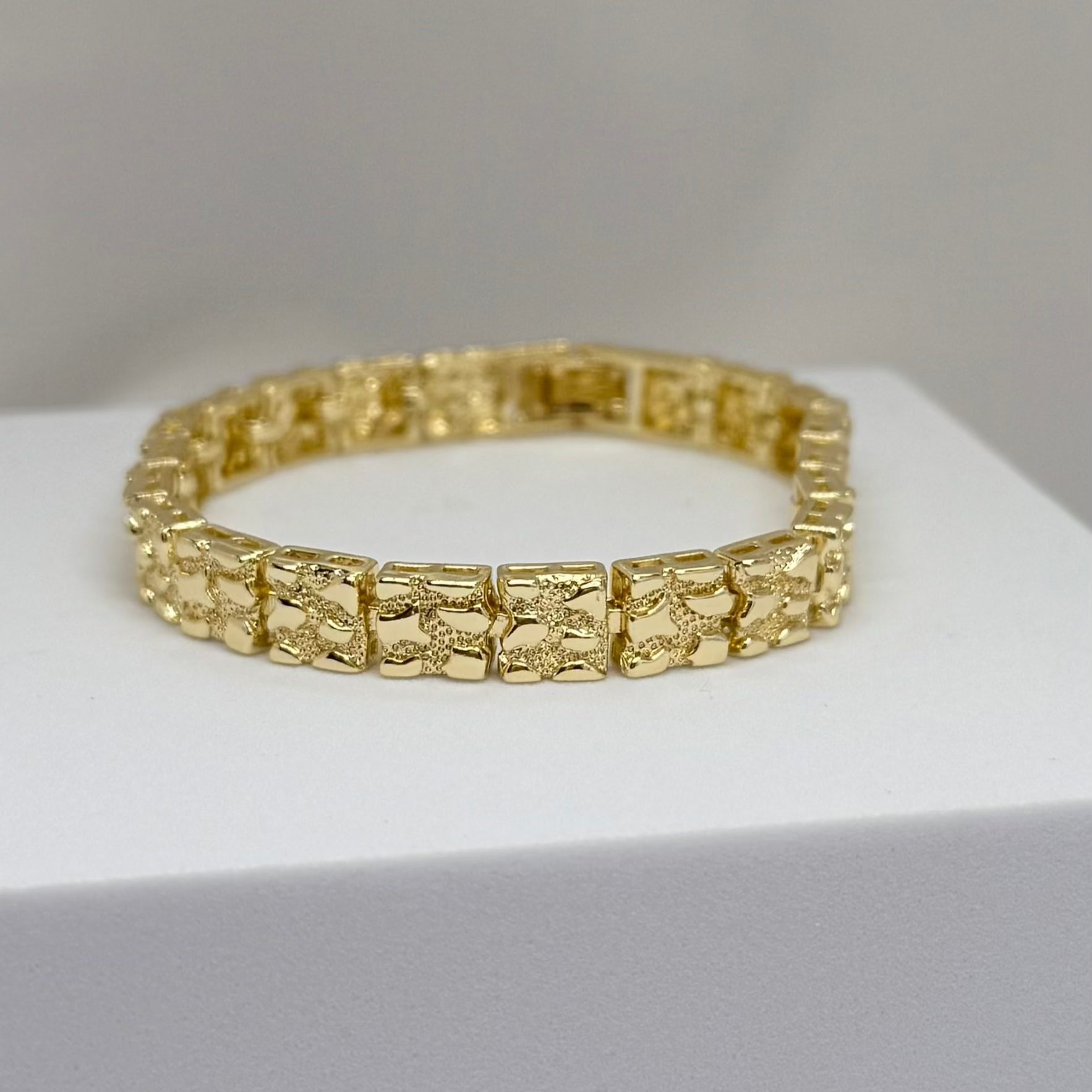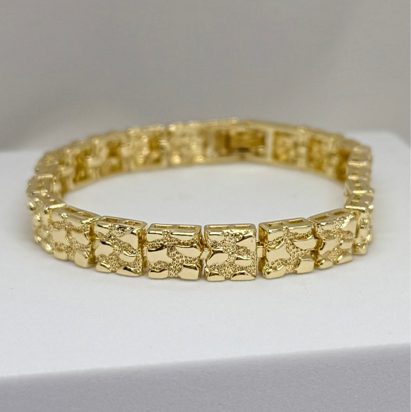 Make a bold statement with The Orion Nugget Bracelet — a unisex design featuring square nugget-style links that radiate confidence and character. Measuring 7 inches in length and 10mm in width, this eye-catching bracelet is 18K gold plated over durable brass, offering the perfect mix of shine, strength, and style. Its chunky, high-shine look makes it a standout piece whether worn solo or layered. Perfect for those who love bold, fashion-forward accessories.