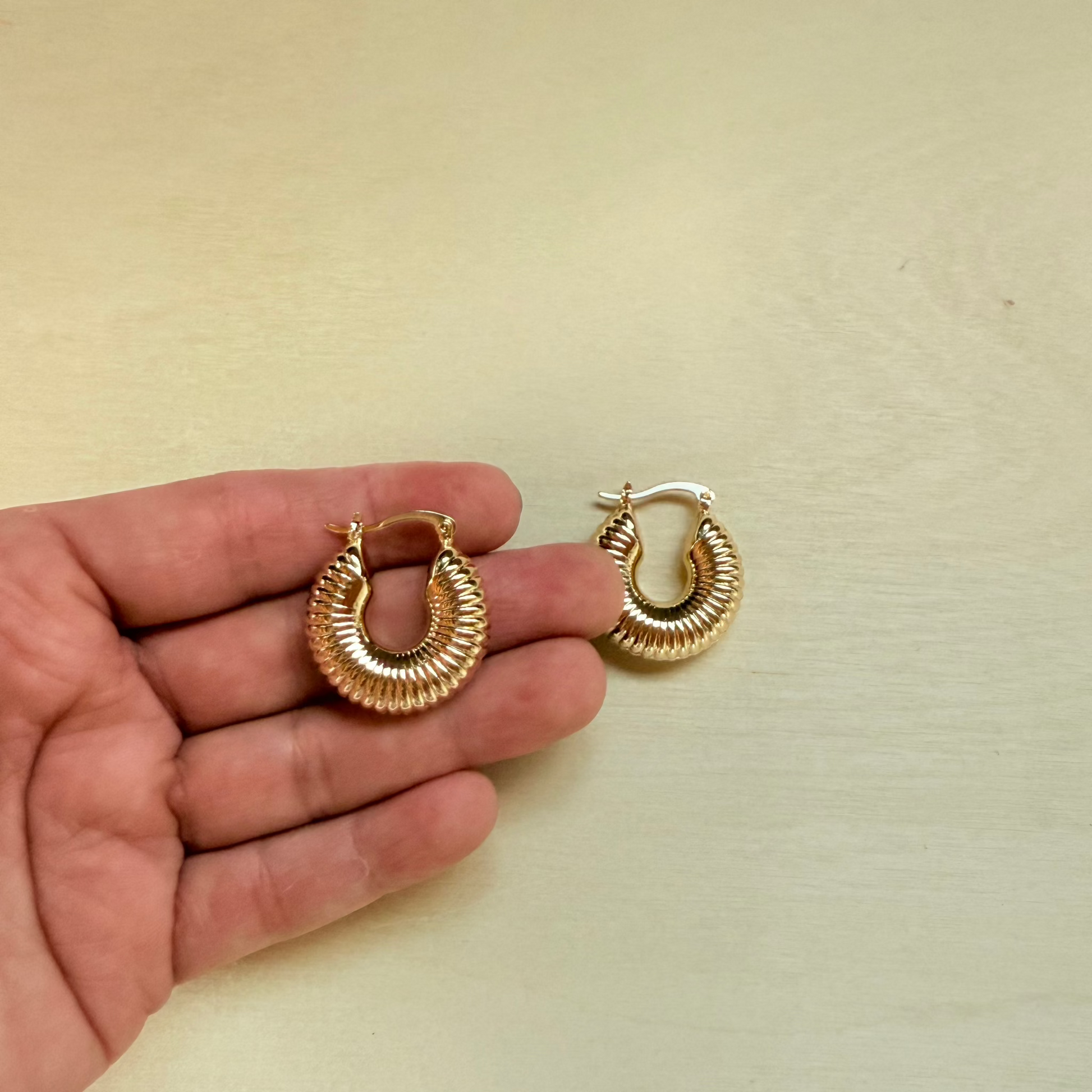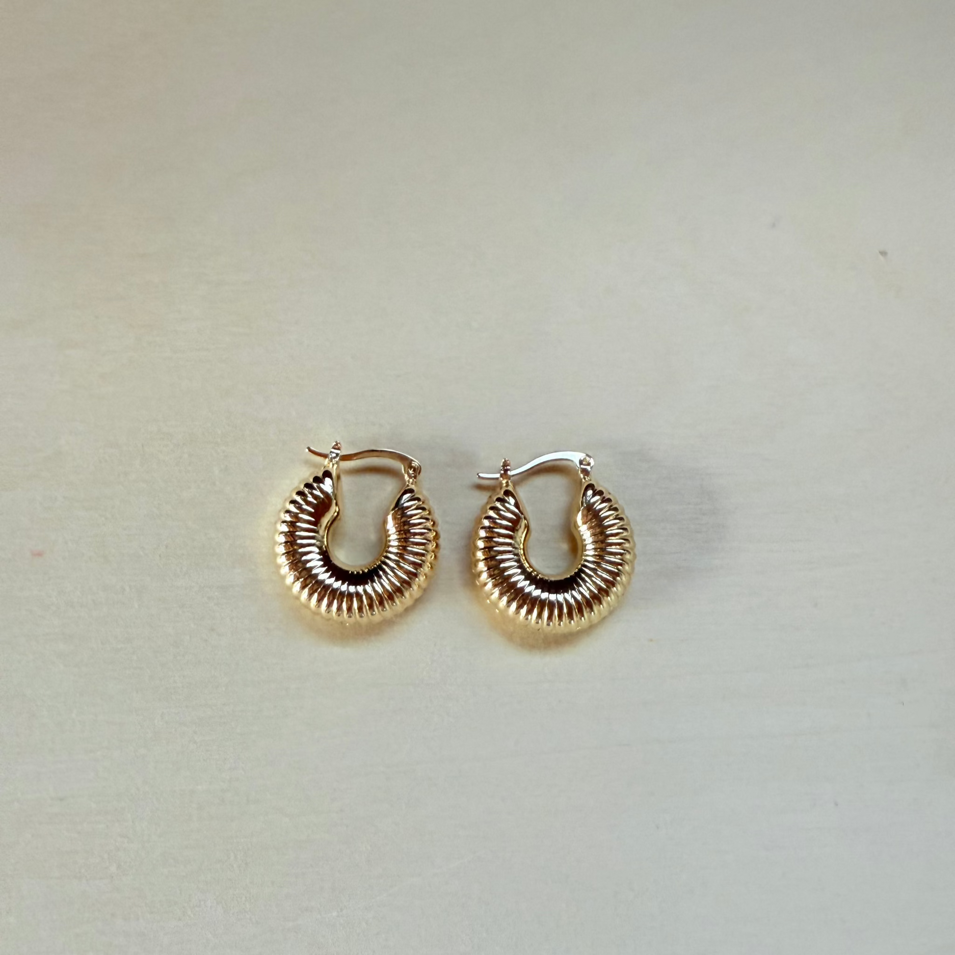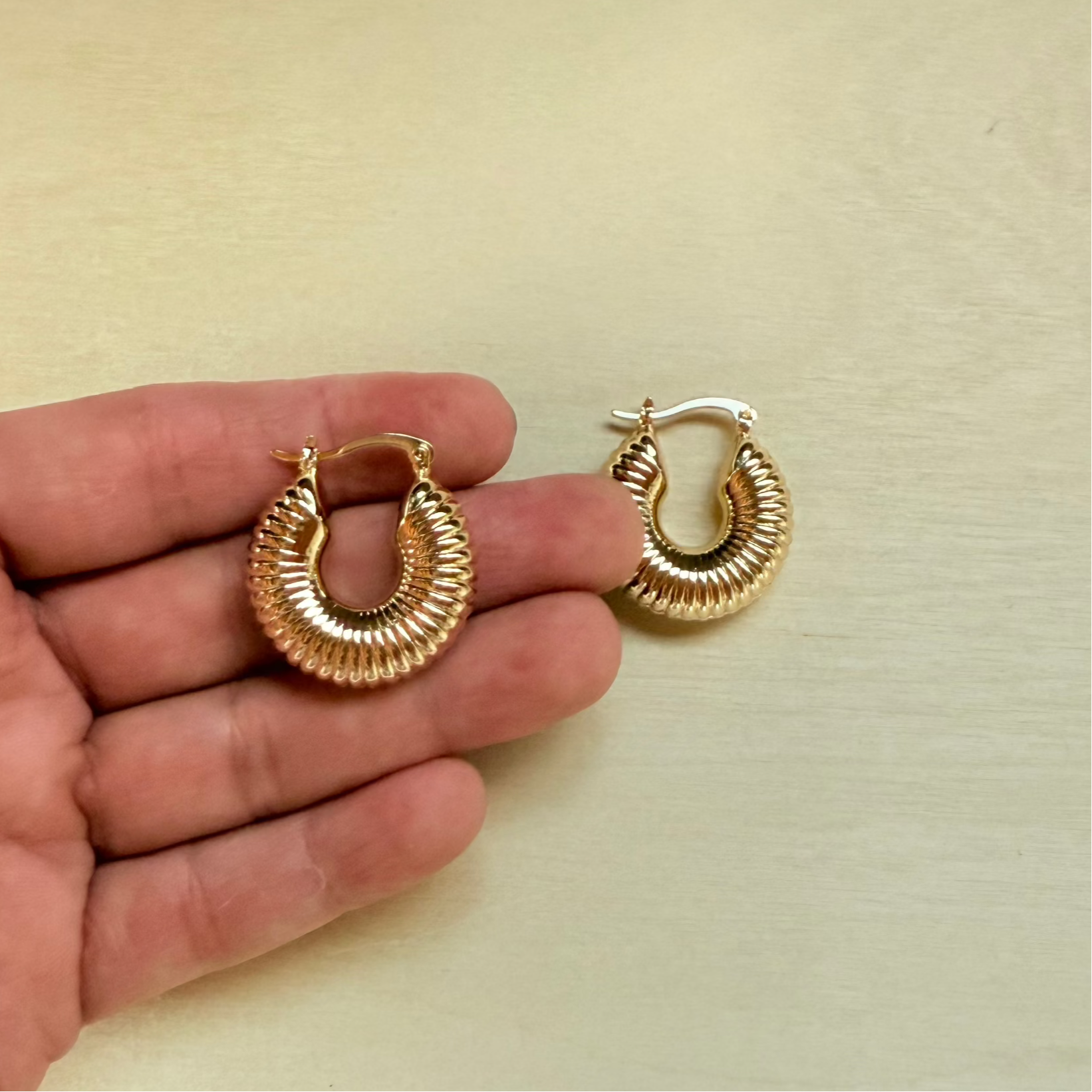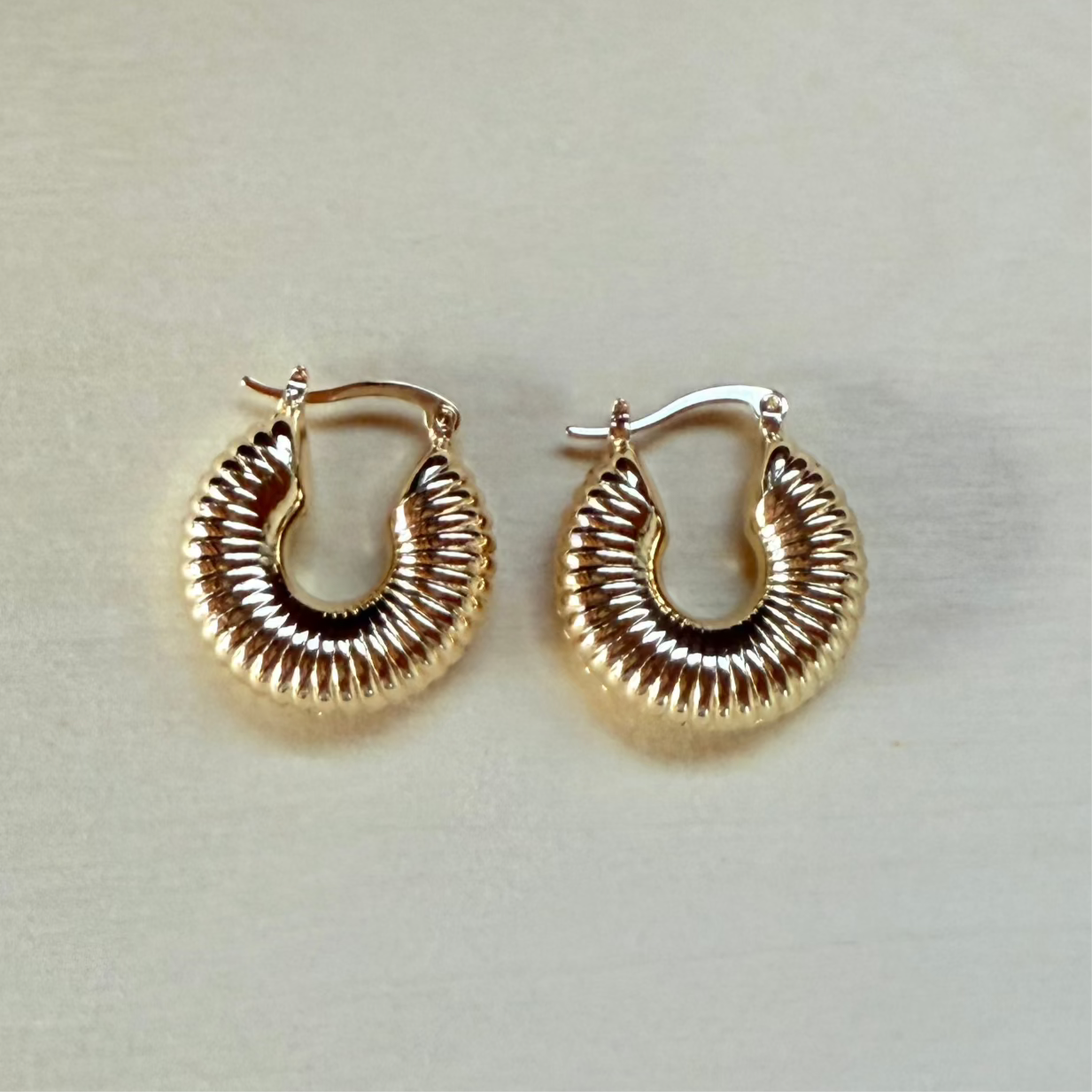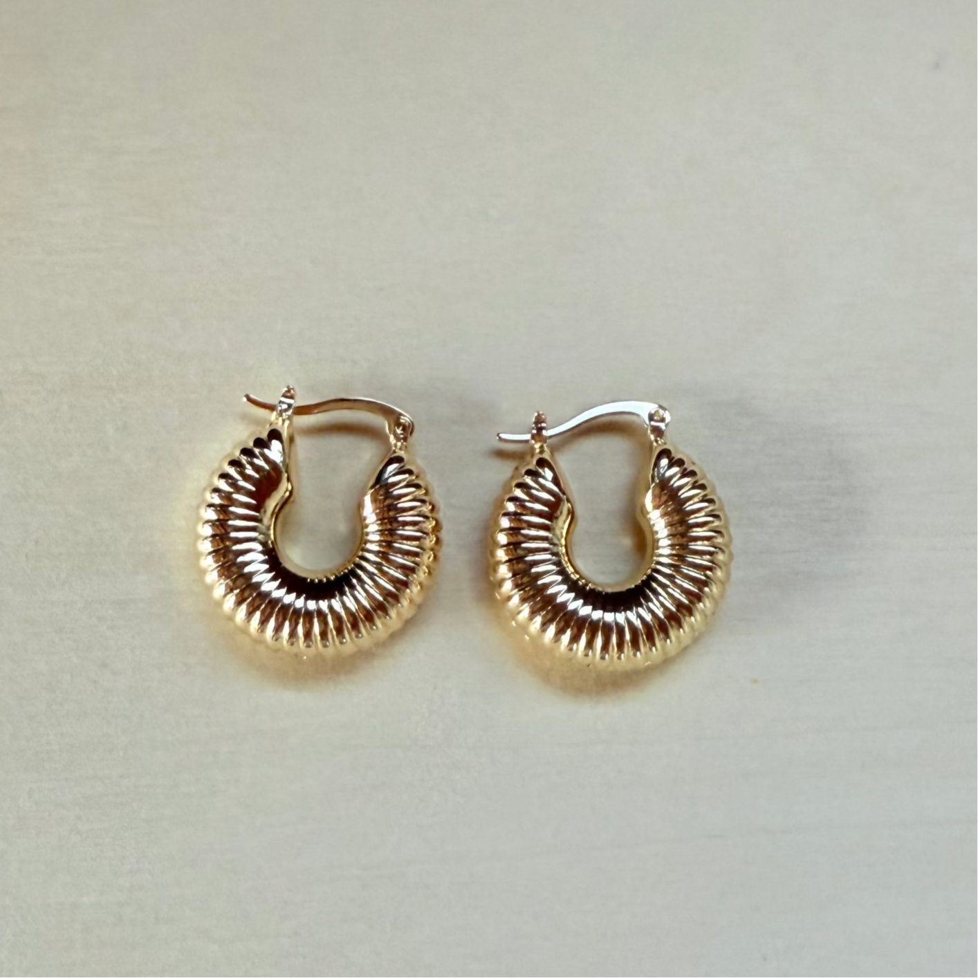 Make a bold yet elegant statement with our Ribbed Glow Hoops. These mini hoops measure 30mm in diameter with a chunky 20mm thickness, giving them a full, voluminous look without the weight. Crafted in brass and bathed in rich 18K gold, they’re ultra-lightweight and hypoallergenic—perfect for everyday wear with high-end shine. Style them solo or layered for a timeless glow.